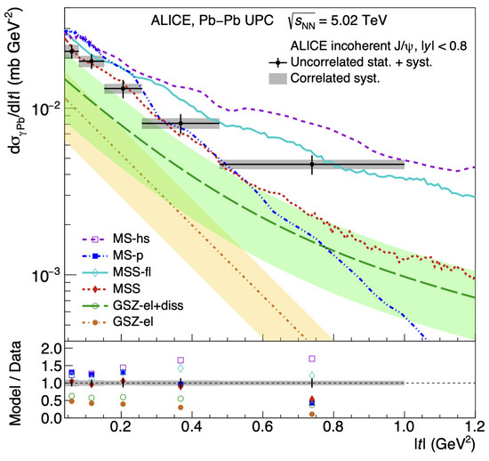 - ALICE Collaboration. First Measurement of the |t| Dependence of Incoherent J/ψ Photonuclear Production. Phys. Rev. Lett. 2024, 132, 162302. [Google Scholar] [CrossRef]