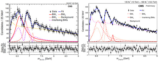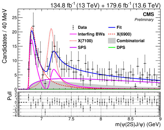 - CMS Collaboration. New Structures in the J/ψJ/ψ Mass Spectrum in Proton-Proton Collisions at = 13 TeV. Phys. Rev. Lett. 2024, 132, 111901. [Google Scholar] [CrossRef]