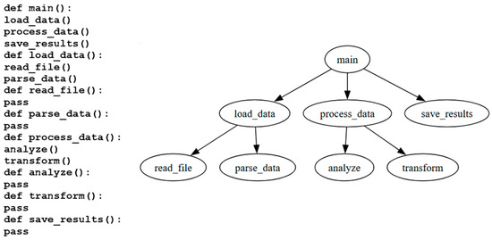By converting source code into an MDG structure, functionally related modules can be grouped into logical clusters. Figure 2 illustrates a simple Python program and its corresponding call graph. The main function invokes three modules: load_data, process_data, and save_results. The MDG visually captures the relationships among these functions. In the MDG, load_data calls both read_file and parse_data, while process_data depends on analyze and transform. These edges highlight the internal flow of control and data, making it easier to identify coupled components. In the proposed SMC method, the MDG provides a useful abstraction for software clustering, modularization, and further analyses such as change propagation.