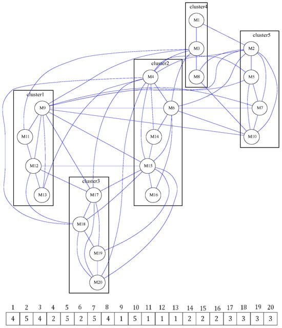 Figure 3 illustrates the structure of a real-world software system, where nodes represent modules and directed edges represent call relationships. In this case study, the system contains 20 modules, so the clustering array length is 20. The array shows that module 1 is assigned to cluster 4, module 2 to cluster 5, and module 3 to cluster 4. The clustering structure is non-uniform, with some clusters being more densely populated. This reflects the natural modularity found in many software systems. Modules within the same cluster are assumed to be strongly interrelated and share functional responsibilities. Each clustering configuration represents a potential solution defining how modules are grouped into cohesive and loosely coupled components. The quality of these solutions is evaluated using the MQ metric.