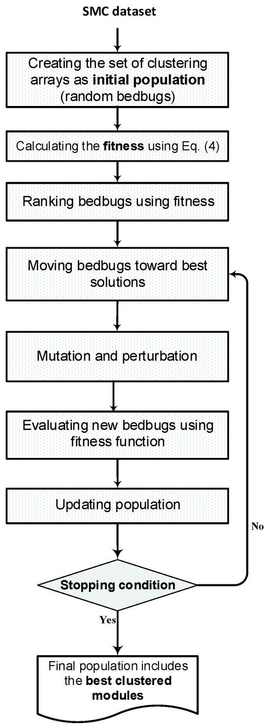 The proposed method employs the BBOA, a population-based metaheuristic inspired by the propagation behavior of bedbugs. The pseudocode of the BBOA used in this method is presented in Algorithm 1. The algorithm begins by initializing the bedbug population and their velocities (explained in the Solution Encoding subsection). The adapted discrete version of the BBOA was specifically used to deal with the SMC problem in the next step of this research. In this adapted BBOA, each bedbug is symbolized by an array of integers representing its clustering configuration.