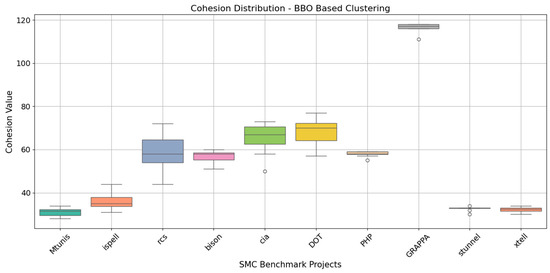 Bison and CIA showed moderate stability. Bison’s cohesion ranged from 51 to 60, while CIA’s varied between 50 and 73. These fluctuations indicate that the BBOA performs reasonably well but can sometimes converge to suboptimal solutions, possibly due to initial population differences or search dynamics. In contrast, the DOT project demonstrated high and stable cohesion between 57 and 77 across all runs. This suggests that the BBOA effectively captures strong modular relationships in this case. The most consistent results came from the PHP and GRAPPA projects. PHP showed a narrow range of 55 to 59, indicating stable clustering performance. GRAPPA had the highest cohesion values, ranging from 111 to 118 in every run. These results highlight the BBOA’s robustness in handling systems with clear structural boundaries.
