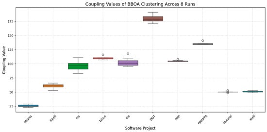 Coupling is another key metric in SMC that reflects inter-cluster dependencies. An effective clustering method, such as the BBOA, aims to reduce coupling while maximizing cohesion. Lower coupling indicates that modules within each cluster primarily interact internally, which supports modularity, maintainability, and reusability. As illustrated in Figure 6, the coupling values varied across eight independent runs and across different benchmark systems. Mtunis, stunnel, and xtell consistently show low coupling values, typically ranging from 23 to 33. This indicates well-separated clusters with minimal external dependencies. The consistency across runs suggests that the BBOA performs reliably for smaller or well-structured systems.