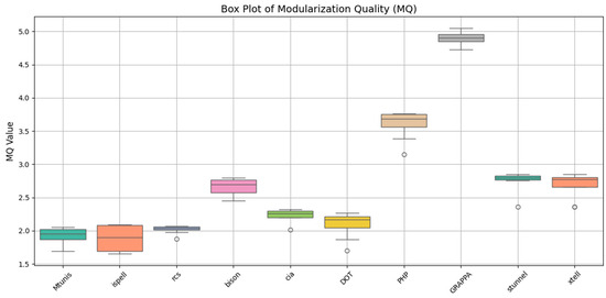 Figure 8 presents the boxplot analysis of MQ for ten software benchmark systems across multiple runs. MQ is a comprehensive metric that captures the overall quality of clustering by combining both cohesion and coupling properties. Figure 8 reveals that GRAPPA consistently achieves the highest MQ scores, with median values around 4.9 and narrow interquartile ranges; these results indicate stable and optimal clustering behavior. Similarly, PHP demonstrates robust MQ performance, with values ranging from approximately 3.1 to 3.76. In contrast, systems like ispell and DOT exhibit lower MQ scores, with wider variability in some cases. These fluctuations suggest that the internal structure of these systems may pose challenges to achieving high modularization. Despite this, their MQ scores remain within acceptable bounds, which confirms the general adaptability of the BBOA method. Projects such as bison, rcs, and cia show moderate MQ values with relatively tighter spreads and indicate reliable performance across runs. The stunnel, xtell, and Mtunis systems, while exhibiting slightly lower maximum values, demonstrate consistent MQ scores. The results presented in Figure 8, when interpreted alongside the cohesion and coupling analyses, emphasize the effectiveness of the proposed BBOA-based approach in generating balanced, high-quality clusters. It not only captures high intra-cluster cohesion and low inter-cluster coupling but also translates these into strong overall modularization quality.