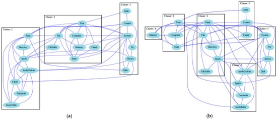 Two different clustered models for the mtunis software project, which includes 20 modules and 57 edges among the modules. (a) Clustering 1: MQ: 1.85882, cohesion: 36, coupling: 21, number of clusters: 3. (b) Clustering 2: MQ: 2.13025, cohesion: 24, coupling: 33, number of clusters: 6.