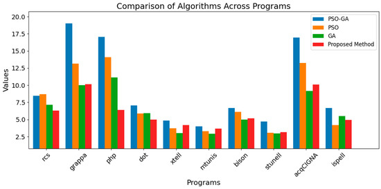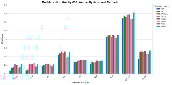 The comparison of MQ across various clustering methods (implemented under identical software and hardware environments) demonstrates the effectiveness of the proposed BBOA in producing high-quality software modularizations. MQ is a widely accepted metric for evaluating clustering quality, as it reflects the degree of internal cohesion within clusters and the extent of coupling between them; higher MQ values are indicative of more coherent and maintainable module groupings. Figure 11 shows the MQ values obtained by different methods in different benchmark software projects. Among the six evaluated methods (GA, ACO, PSO-GA, SFLA, SCSO) and the proposed BBOA, the BBOA consistently achieved the highest MQ values across the majority of the ten benchmark software systems. Regarding the results, the BBOA outperformed all other techniques. In large-scale systems such as GRAPPA, PHP, and bison, the BBOA demonstrated significant superiority, whereas in smaller systems, like Mtunis and ispell, it remained highly competitive.