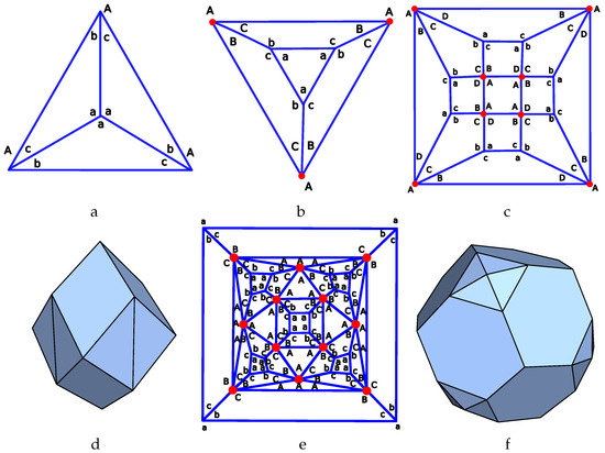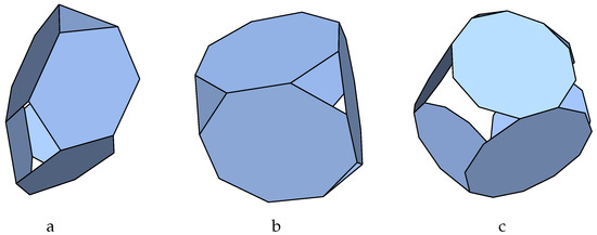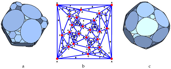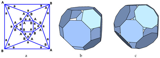 We denote and as the number of edges for the face belonging to family I and II, respectively. Following [44,45], the family of type I is chosen to be the one with 3 neighbours.