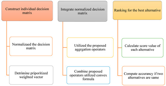 Suppose there are alternatives and criteria along with a criterion weight vector such that and in a CPF environment. Further, represents the evaluation of each alternative for the given alternatives. This matrix represents the MCDM problem in the context of CPFNs.
