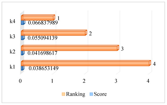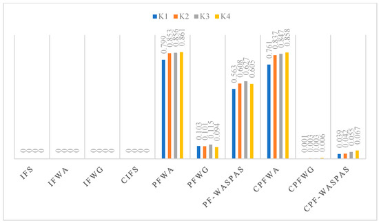 Figure 4 illustrates the ranking results obtained using CPFS-WASPAS. The superiority of K4 is quite evident and should be considered first for adoption in service strategies with AI. A moderate performance has been recorded with and , and the worst overall performance has been recorded with , which accords with the tabular analysis in Table 7.