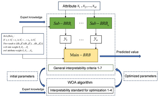 Predicting stock price trends is crucial for ensuring financial market stability, promoting rational resource allocation, and preventing systemic risks. Interpretable models can clearly present the logic and basis of stock price prediction, enabling investors and decision-makers to understand the model’s prediction process and thereby increasing their trust in the model’s prediction results. Therefore, to simultaneously ensure the interpretability and accuracy of the model, a new method based on hierarchical Belief Rule Base with balanced accuracy and interpretability for stock price trend prediction is proposed under interpretability constraints. The core architecture of the HBRB-b model is a hierarchical design, which solves the problem of explosive combination rules in the traditional BRB model. This structure is crucial for practical applications as it reduces the complexity of the model to a level that is auditable and manageable for human experts—a prerequisite for trusting financial analysis. Firstly, the input attributes are processed through multiple sub-BRBs. Each sub-BRB contains belief rules initialized by expert knowledge to generate intermediate results. Subsequently, the main BRB integrates these results to output the predicted values. The system employs the Whale Optimization Algorithm (WOA) to optimize rules and weights, simultaneously satisfying both general interpretability criteria and optimization-specific interpretability standards, thereby achieving a reasoning process that is both highly accurate and transparent. Figure 1 illustrates the overall structure of the interpretable stock price trend prediction model based on the WOA and the hierarchical Belief Rule Base. Section 4.1 Defines the interpretability of the model. The structure of the stock price trend prediction model is defined in Section 4.2. The reasoning process of the model is detailed in Section 4.3, while the optimization process is outlined in Section 4.4. Section 4.5 provides a practical exercise example.
