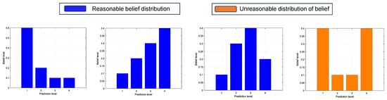 To construct the initial model based on HBRB-b, belief rules need to be formulated. According to the evaluation of experts, five semantic levels—“Very Low” (VL), “Low” (L), “Medium” (M), “High” (H), and “Very High” (VH)—were selected to represent the state of the system, as shown in Formula (22).