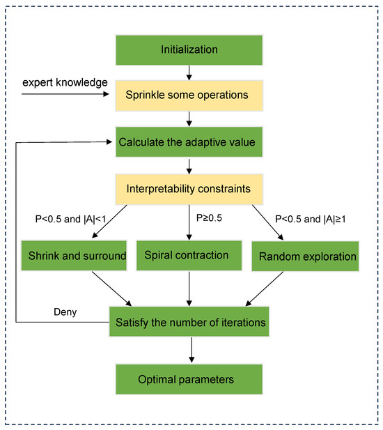To ensure the interpretability of the model optimization process, this paper adds interpretability constraints on the basis of the original WOA. Figure 3 shows the flowchart of the WOA with interpretability constraints, and its specific optimization steps are as follows.