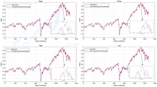 Figure 4 presents the relationship between the four normalized attributes and the stock price of the next day.