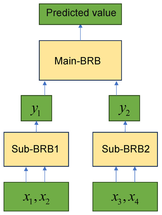 In the HBRB-b model, the prediction process initiates from the underlying sub-BRBs, which aggregate the attributes of their inputs. The output of each sub-BRB then becomes the input for the subsequent higher-level BRB. This hierarchical transmission continues layer by layer until it reaches the top-level BRB. Ultimately, the inference is completed at the top-level BRB to yield the final prediction result. Each BRB in this process follows the form of Equation (12).