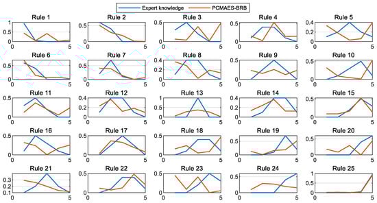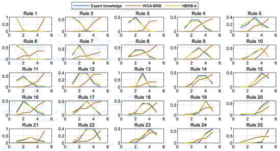 To evaluate the interpretability of the models, this section compares the PCMAES-BRB, DE-BRB, WOA-BRB, and HBRB-b models, with a focus on analyzing the belief distribution of the initial rules and the optimized rules of these models. As shown in
