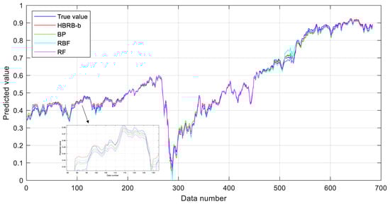 Figure 11 shows the comparison between the predicted values and the true values of HBRB-b and the other three machine learning models. Overall, the prediction curves of all models can follow the changing trend of the true values quite well. However, within the data range of 100 to 150, when the predicted values fluctuate greatly, the predicted values of the HBRB-b and RBF models are closer to the true values, showing better adaptability and accuracy. Euclidean distance is an important indicator for measuring the difference between the predicted value and the true value. The smaller its value is, the higher the prediction accuracy of the model is. Among all models listed in