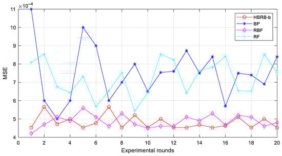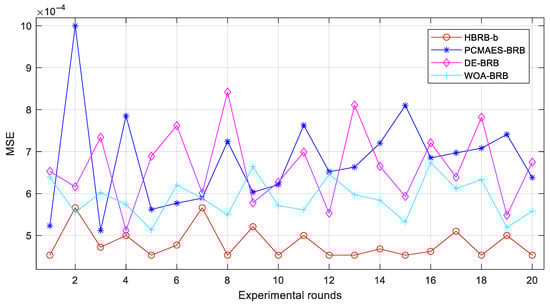 The experimental analysis compared four stock price trend prediction models: PCMAES-BRB, DE-BRB, WOA-BRB and HBRB-b. Mean square error (MSE), calculated as shown in Equation (