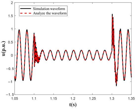 Comparison of simplified model simulation verification. In Figure 2, the “analyzed waveform” refers to the transient voltage waveform derived based on the analytical model of the AC transmission system for offshore wind power (Equations (1)–(8) in Section 2.2). This waveform is mathematically derived through Kirchhoff’s laws and the relationship between the node current, reflecting the theoretical calculation results of the transient voltage at the common coupling point (PCC) under symmetrical faults. The “simulation waveform” refers to the transient voltage waveform generated by the simplified equivalent model built through PSCAD/EMTDC. This waveform is the experimental simulation result and is used to verify the correctness of the analytical model.