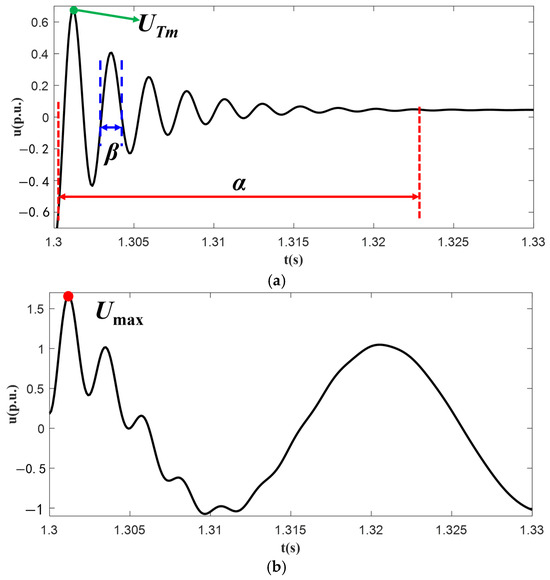 All subsequent analyses in the following sections will be conducted with respect to these defined fault transient characteristics, as shown as Figure 3. In the Figure 3a, the green marker and arrow, labeled UTm, represent the peak value of transient voltage; the red part, labeled α, denotes the duration of the transient process; the blue dashed line, labeled β, indicates the period of voltage oscillation. The red dot in Figure 3b marks the maximum voltage value Umax that occurs during the transient oscillation process at the initial stage of the fault, reflecting the voltage peak characteristics of the transient oscillation caused by symmetry breaking at the initial stage of the fault.