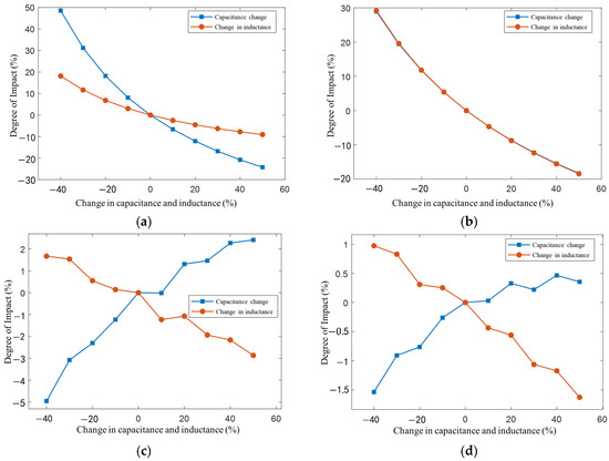 Figure 4. Influence of capacitance and inductance changes on fault characteristics. (a) Transient decay rate; (b) transient oscillation frequency; (c) transient maximum magnitude; (d) transient voltage peak. - Transient oscillation frequency β (10): This is inversely related to Ceq/Leq; both have a similar effect (±10% variation, difference ≤ 1%) (Figure 4b).