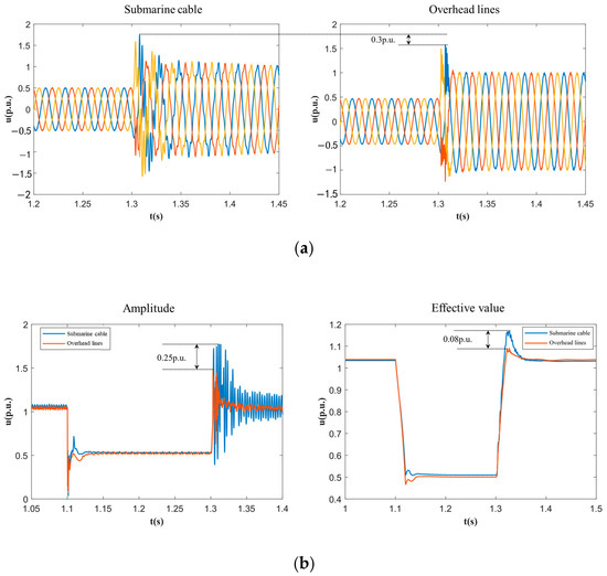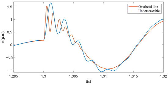Ref. [32] shows that submarine cables have a ~15× capacitance and ~0.4× inductance vs. overhead lines, causing symmetry–asymmetry gaps; their transients decay slower, and their voltage peaks are higher (Figure 5).