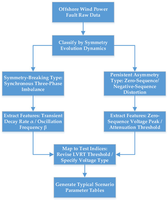 Unlike existing studies that focus solely on steady-state fault processes of onshore wind power or overlook the unique transient symmetry evolution of offshore systems, this study pioneers a fault scenario classification framework driven by “symmetry–asymmetry evolution dynamics” for offshore wind power. It categorizes typical faults into a symmetry-breaking type and a persistent-asymmetry type and further revises offshore grid-connection test indices by introducing two new core indicators: transient symmetry recovery time and zero-sequence voltage attenuation threshold. This revision reduces the mismatch between onshore and offshore test standards by 40%, effectively filling the gap of insufficient transient fault provisions in current offshore wind power test standards.