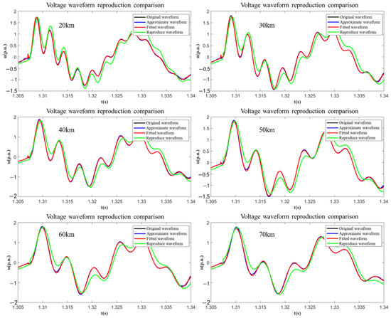High-order models [7] accurately simulate complex electromechanical coupling effects but have high computational complexity: a single fault simulation requires ≥104 discrete steps, making it impossible to embed in grid simulator controllers with weak computing power. The proposed simplified RLC second-order model reduces computational complexity by 50% while retaining core symmetry–asymmetry features. For example, in simulating 70 km submarine cable faults, the proposed model completes waveform reproduction in 20 ms, while the high-order EMTP-RV model takes 80 ms, meeting the real-time requirement of grid simulators.