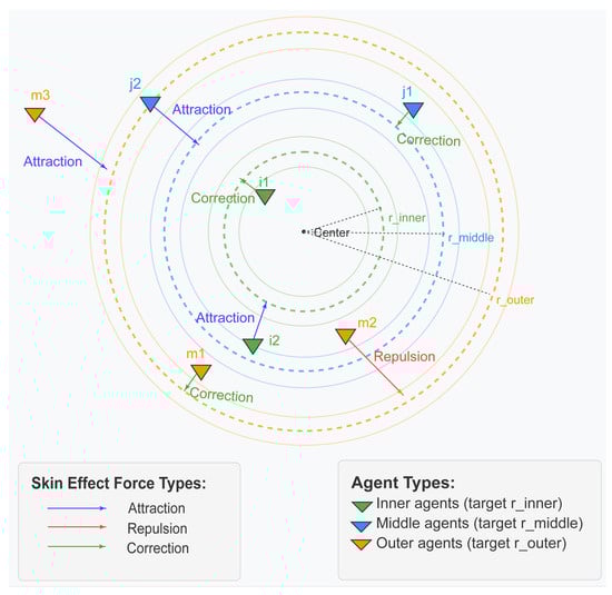 In Figure 1, the mechanism of radially symmetric spontaneous layering driven by the skin effect, as defined by Formula (13), is intuitively demonstrated. The figure comprises three distinct types of individuals: inner-layer individuals (green triangle i, target radius ), middle-layer individuals (blue triangle j, target radius ), and outer-layer individuals (orange triangle m, target radius ). It is evident that outer-layer individual and middle-layer individual are both located outside their respective target rings (orange and blue dashed rings), consequently rendering them susceptible to a strong attractive force towards the center, which effectively pulls them back into the target region. The outer-layer individual has drifted to the inner side of its target ring, resulting in subjection to a strong repulsive force away from the center, thereby pushing it towards the outer layer. The outer-layer individual , the middle-layer individual , and the inner-layer individual are all located inside their respective target rings but are not precisely on the target radius. The particles are subjected to a smaller corrective force, which exerts a precise pulling or pushing force on them, thereby adjusting their position to their respective target radii (illustrated as the solid orange, blue, and green rings in the figure). This process enables fine-tuning of their positions.