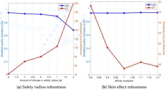 To address the model’s sensitivity to parameter variations and ensure reproducibility, we conducted systematic robustness tests on two critical parameters: safety radius () and skin force scale (). We evaluated model performance using two metrics: the Layering Quality Index (LQI), representing the proportion of agents correctly positioned within their target layer bands (), and the Convergence Time (CT), denoting the number of iterations required to achieve LQI .