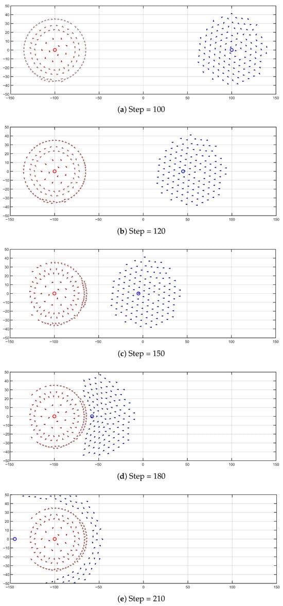 The simulation results are displayed in Figure 4. Figure 4a: Initial Aggregation Stage (Step = 100). In the early stages of the simulation, the defensive group and the threat group each follow their internal attraction–repulsion rules to self-organize and aggregate within their predefined initial regions, forming relatively stable initial cluster structures. However, due to the absence of radial symmetry constraints, individual distributions exhibit unevenness.