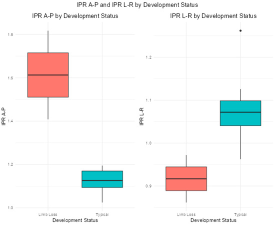 IPR L-R was, on average, slightly less than one (0.96 ± 0.25) in the LLD group and greater than one (1.12 ± 0.38) in the LLD group. The IPR L-R regression model required a transformation in order for the assumptions of inference (normality and constant variance) to be reasonably met. Per the model, the square root of the L-R value for TD was 0.08 greater than for children in the LLD group, on average, controlling for age and mass, with a significant difference (p < 0.001) (Table 2). However, when IPR L-R was modified for the TD group to reflect contralateral limb divided by ipsilateral limb (IPR C-I) and compared to IPR L-R in the TD group, the difference was no longer significant (p = 0.570).