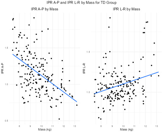 Scatterplot for IPR A-P and IPR M-L versus body mass in kg in the typically developing cohort. Blue lines indicate line of best fit.