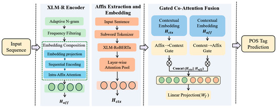 Part-of-speech (POS) tagging assigns each token in a sentence to its corresponding grammatical category (e.g., noun, verb, adjective) and serves as a foundational step in many downstream natural language processing (NLP) pipelines, including named entity recognition, machine translation, information extraction, and question answering [1,2,3,4]. While modern pretrained models achieve high accuracy on high-resource languages, their performance degrades significantly when faced with morphologically rich and low-resource languages (MRLs/LRLs). In such settings, the combination of extensive affixation and pervasive out-of-vocabulary (OOV) forms leads to data sparsity and ambiguous tag assignments, hindering both syntactic and semantic analysis.