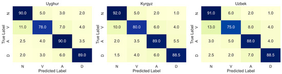 In the examples, it can be found that overlapping affix sequences can be grouped into different morphological units, and only context-sensitive features resolve the correct parse. Additionally, many errors occur in syntactically underspecified contexts, where the model lacks sufficient cues to resolve ambiguity. To illustrate these patterns in detail, Figure 4 presents normalized confusion matrices for Uyghur, Kyrgyz, and Uzbek. Across all three languages, verbs are frequently misclassified as nouns (V→N) at rates of 11–13%. In addition, we observe the following: