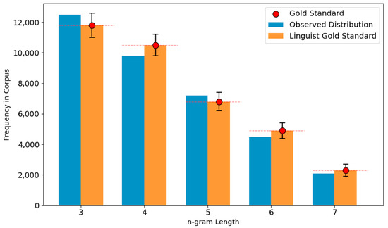 Distribution of affix n-gram frequencies observed in the corpus versus a linguistically validated gold standard. Red dots and dashed lines highlight gold reference points. Annotated labels describe typical morphological functions per n-gram length.