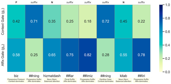 To empirically validate the symmetric design and illustrate how MRL-POS integrates affix and contextual information at inference time, we visualize gate activation for each token in a real-world Uyghur sentence: “Bizning hizmatdashlarimizning kitabliri” (“Our colleagues’ books”). As shown in Figure 6, the gating mechanism assigns higher context attention to grammatical function words (e.g., “Bizning”, “##ning”) and stronger affix attention to morphological elements (e.g., “##lar”, “##imiz”, “##liri”).