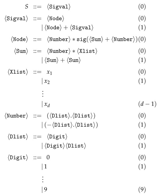 The method that produces artificial neural networks incorporates the Grammatical Evolution procedure. Grammatical Evolution is a genetic algorithm, where the chromosomes are vectors of integers. These integers are rules from a provided Backs–Naur form (BNF) grammar [62] of the target language. The method of Grammatical Evolution was applied in various cases, such as data fitting [63,64], composition of music [65], video games [66,67], energy problems [68], cryptography [69], economics [70], etc. BNF grammars are usually represented as sets , where the letters have the following definitions: