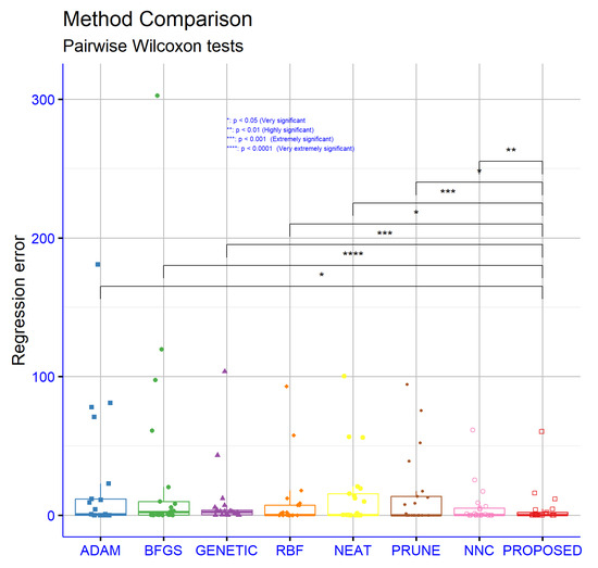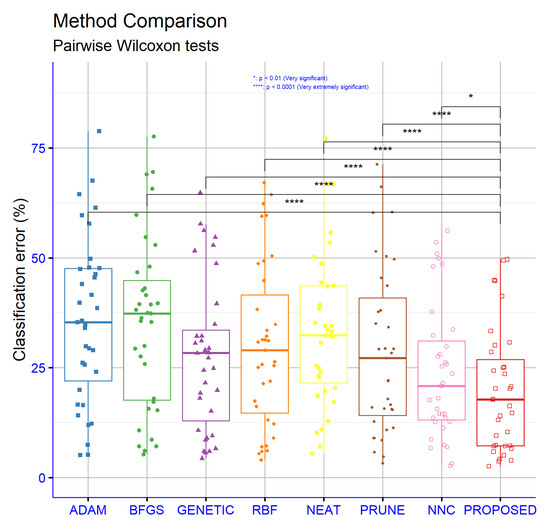 - Arifovic, J.; Gençay, R. Using genetic algorithms to select architecture of a feedforward artificial neural network. Phys. A Stat. Mech. Its Appl. 2001, 289, 574–594. [Google Scholar] [CrossRef]