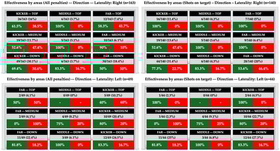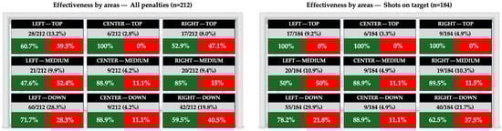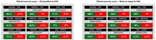 Figure 4 shows the effectiveness of penalty kicks based on shot direction and the kicker’s laterality, distinguishing between right-footed and left-footed players. As in Figure 3, the left panels include all penalties (n = 212), while the right panels consider only on-target shots (n = 184).