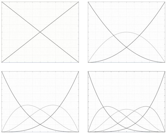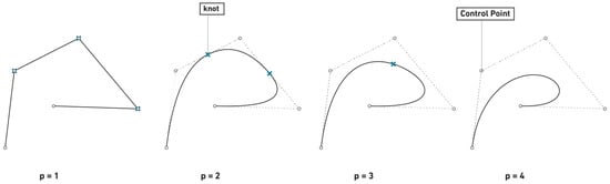 The table below shows the knot vectors associated with the curves shown in Figure 2. They all have the same number of points and, therefore, the same amount of basis functions. However, the amount of nonzero knot spans reduces with each degree elevation. For five points, a degree higher than four is impossible. The smoothness increases with each degree elevation. This is due to the order of the basis functions. As the degree increases, more and more points are activated at the same time. In the linear curve, each knot span is affected by two points. In the last p = 4 curve, the whole curve is one single span, meaning that all points are active over the whole curve, with varying effects. The table below shows the knot vectors for the four examples (Table 1).