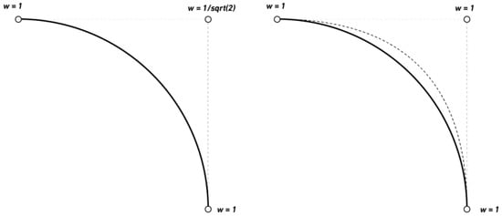 (Right) NURBS with weights describes perfect quarter circle. (Left) B-spline with constant weights.