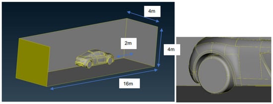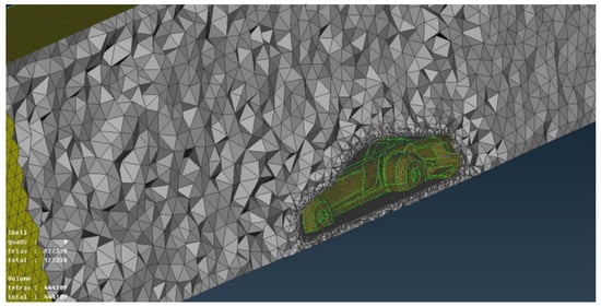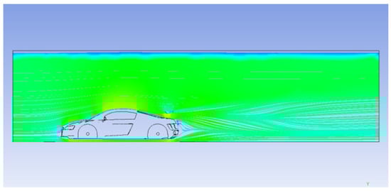 To prevent backflow into the simulation domain (Figure 7), the outlet velocity boundary condition was set as an inlet–outlet condition. The car surface and ground were assigned no-slip conditions, while the wheels were modelled with the rotating-Wall-Velocity boundary condition. Slip conditions were applied to the lateral and top boundaries of the domain. To account for near-wall viscosity effects, the nut-U-Spalding-Wall-Function approach was used [28].