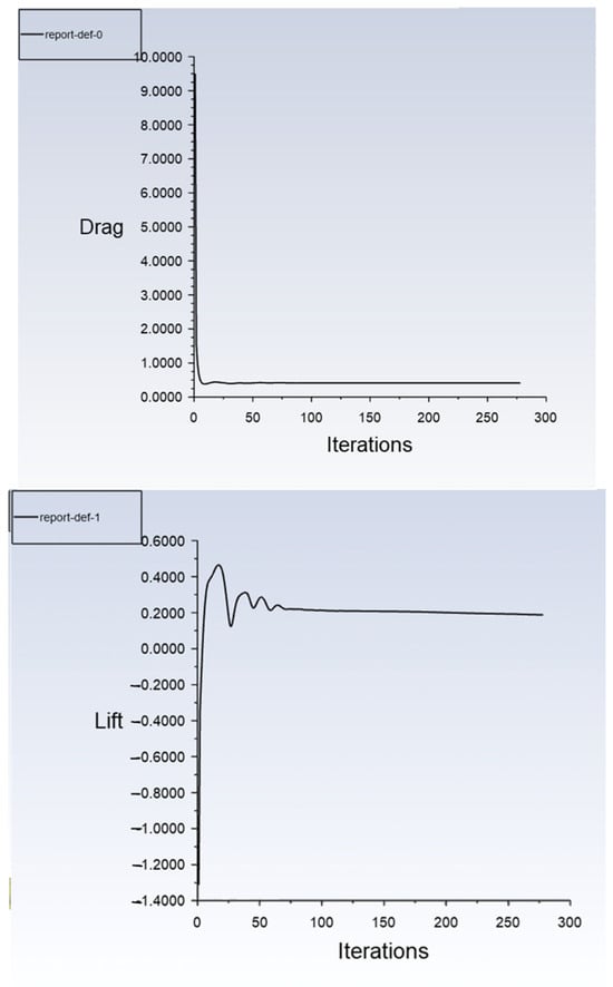 Figure 9 illustrates the convergence histories of the drag and lift coefficients during the simulation. The drag coefficient converges to a stable value of Cd = 0.443415 after approximately 30 iterations, while the lift coefficient stabilizes at Cl = 0.184169 following initial oscillations, around iteration 100. The absence of significant fluctuations in both curves confirms that the solution has reached a steady state. These final values demonstrate good convergence behavior, indicating the numerical stability and reliability of the aerodynamic simulation.