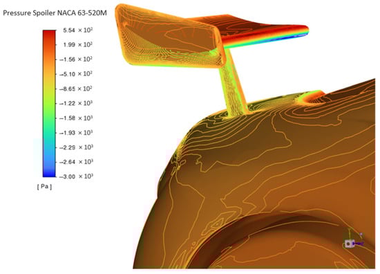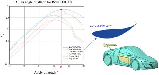 Designing a spoiler to improve a vehicle’s aerodynamic performance involves optimizing its shape, position, and integration with the overall vehicle design to achieve specific goals, such as reducing drag, increasing downforce, and enhancing stability [31]. The spoiler should be placed at the rear of the vehicle, with its height and angle precisely tuned to achieve a balance between drag reduction and downforce. A cross-section shape (see Figure 11) is chosen using open access airfoil databases [32] for optimal aerodynamic profiles, and vertical endplates minimize flow separation and turbulence, while adjustable features allow for adaptation to different driving conditions. Lightweight materials, such as carbon fiber or aluminum, are essential to avoid adding excessive weight. CFD analysis and wind tunnel testing are critical for validating performance and optimizing design. Additionally, the spoiler should align aesthetically with the vehicle, comply with safety regulations, and avoid disrupting airflow around other aerodynamic elements. Tailoring the design to specific vehicle types, such as sports cars, sedans, or SUVs, ensures maximum effectiveness in achieving aerodynamic efficiency and stability.
