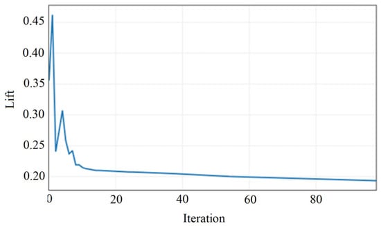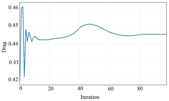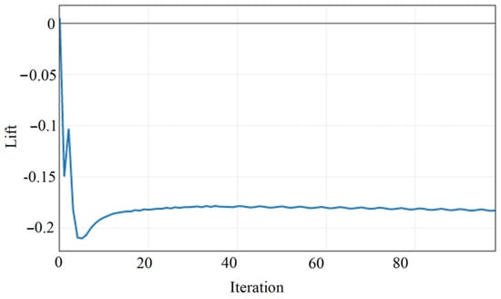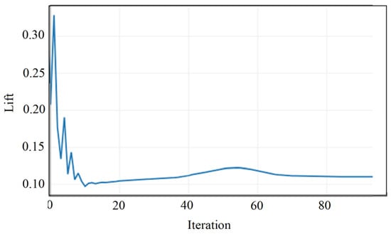 Figure 12 and Figure 13 illustrate the convergence histories of the drag and lift coefficients during the simulation of the spoiler car variant. The drag coefficient converges to a stable value of Cd = 0.529347 after approximately 40 iterations, while the lift coefficient stabilizes at Cl= −0.182030 following initial oscillations, around iteration 20. The presence of small fluctuations in both curves is due to the small changes in the pressure values over the airfoil (see figures below).