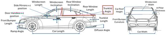 The lift coefficient CL and drag coefficient CD are essential dimensionless parameters that describe the aerodynamic performance of a body moving through a fluid [30]. The lift coefficient quantifies the lift force, which acts upward against the oncoming airflow. This force is primarily influenced by the distribution of pressure over the object’s surface. In contrast, the drag coefficient measures the drag force, which acts in the direction of the airflow. Drag is caused by pressure differences (pressure drag) and viscosity effects (skin friction drag). Both coefficients are affected by several factors, including the object’s shape and orientation, its surface properties, and the characteristics of the surrounding airflow over the car body. By relating these aerodynamic forces to fluid density, airflow velocity, and reference area, the drag and lift coefficients (described in Equation (15)) provide valuable insights into the efficiency and effectiveness of aerodynamic designs.