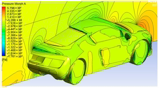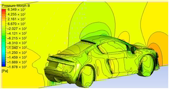 The original model serves as the reference dataset, representing the unmodified geometry with well-established aerodynamic behavior for similar coupe-class vehicles in the literature (Cd ≈ 0.44–0.46) [38]. Compared to the baseline, Morph A achieves a 6.9% reduction in Cd (from 0.4434 to 0.4127) with a marginal increase in Cl, while Morph B maintains a Cd comparable to the baseline but reduces Cl by 40.1% (from 0.1842 to 0.1103), thereby improving aerodynamic stability. These results highlight the targeted optimization effect of NURBS morphing: Morph A prioritizes drag reduction, whereas Morph B focuses on lift suppression.