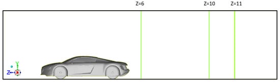 In this section, a comparative analysis framework is implemented to select the optimal variant of the car that meets the desired aerodynamic performance. To achieve this, three vertical axes are defined on the mid-surface (symmetry plane) of the domain at different distances from the origin of the absolute coordinate system: Z = 6 m, Z = 10 m, and Z = 11 m (Figure 25). These control axes are positioned at the rear of the car to more effectively evaluate several key aerodynamic parameters.