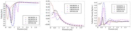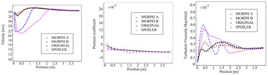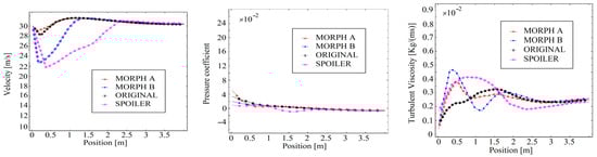 The velocity magnitude shows that the Morph B and spoiler variants generate lower-velocity magnitude in the rear of the vehicle, particularly within the car height range of 0 to 1.3 m. This reduction is due to the deflection of airflow caused by the spoiler and the mini spoiler introduced through NURBS-based optimization.