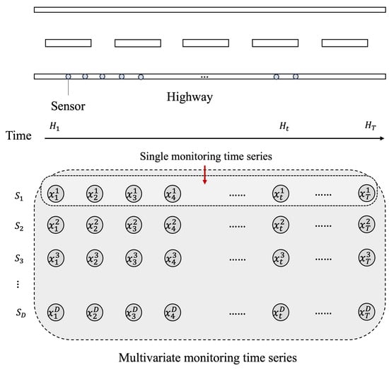 Let T represent the total monitoring period and D the number of sensors. As shown in Figure 1, the collected data can be structured as a multivariate time series . At each time step , the associated sensor measurements are denoted as . Moreover, can be expressed as , where D indicates the dimensionality of the time series, which is equivalent to the number of sensors deployed.